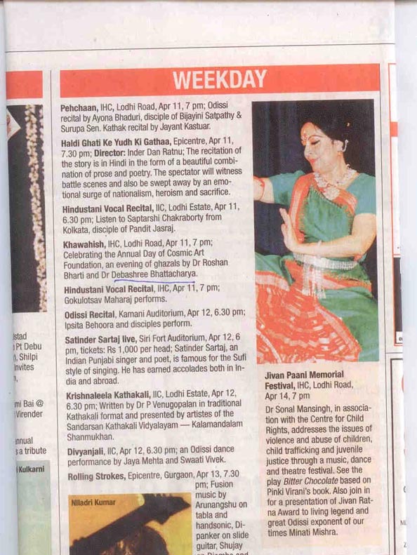 Khawahish, IHC, Lodhi Road, Apr 11,7 pm; Foundation, an evening of ghazals by Dr. Roshan Bharti and Dr. Debashree Bhattacharya.