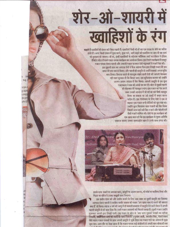 Khawahish, IHC, Lodhi Road, Apr 11,7 pm; Foundation, an evening of ghazals by Dr. Roshan Bharti and Dr. Debashree Bhattacharya.
